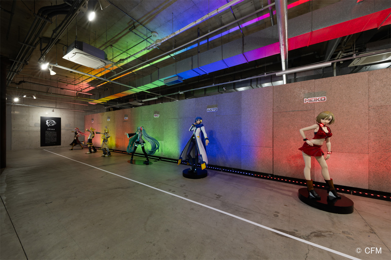 空間の中央には、ボカロシーンの最前線でイラストだけでなく数多くの映像を手がけてきた「たま」氏の作品群、そして「iXima」氏デザインのピアプロキャラクターズ6名全員の等身大立像 が並ぶ。