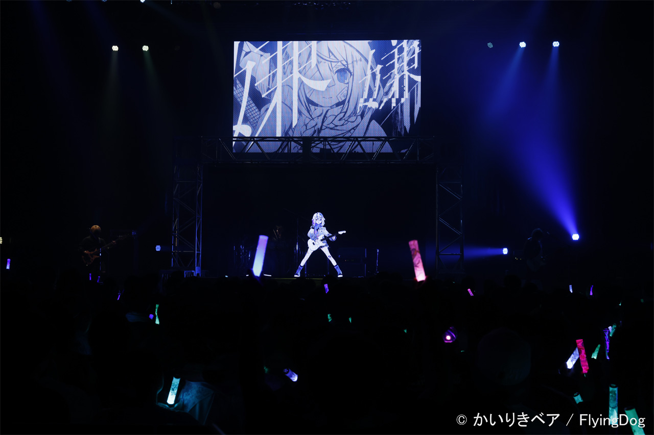 透過液晶にはギターを携えたキャラクターが登場し、ステージ上の実演と呼応するように演出が組み立てられていた。