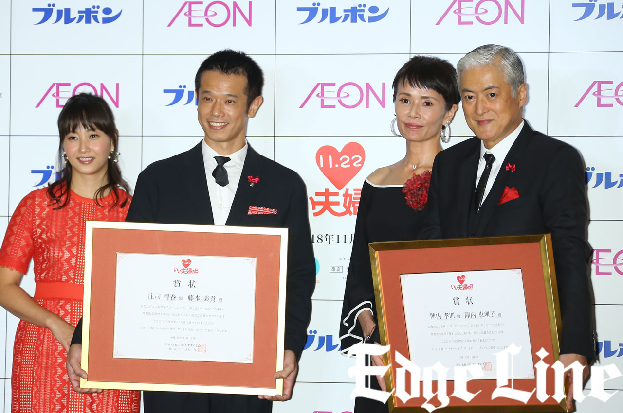 お笑いコンビ『品川庄司』庄司智春(42)とタレント・藤本美貴(33)夫妻、俳優・陣内孝則(60)と陣内恵理子(55)夫妻が12日、都内で『いい夫婦 パートナー・オブ・ザ・イヤー 2018』記者発表会に登場した。
