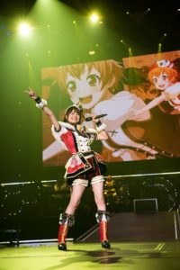 続いてRASがバックバンドとして演奏するゲストパートでは、アイドルバンド『Pastel*Palettes(パステルパレット)』から、ボーカル担当の丸山彩役・前島亜美が登場。スマートフォン向けゲーム『バンドリ! ガールズバンドパーティ!』のキービジュアルを再現した新衣装で登場した前島は『しゅわりん☆どり~みん』を始めとしたカワイイ系チューンを連続で披露したかと思うと、『もういちど ルミナス』をしっとりと聴かせる。さらに、前島は新曲『きゅ~まい*flower』では、アニメPVの振り付けを完全に再現と、圧巻のステージングで、RASの強さとはまた違った「アイドルの強さ」を存分に示した。