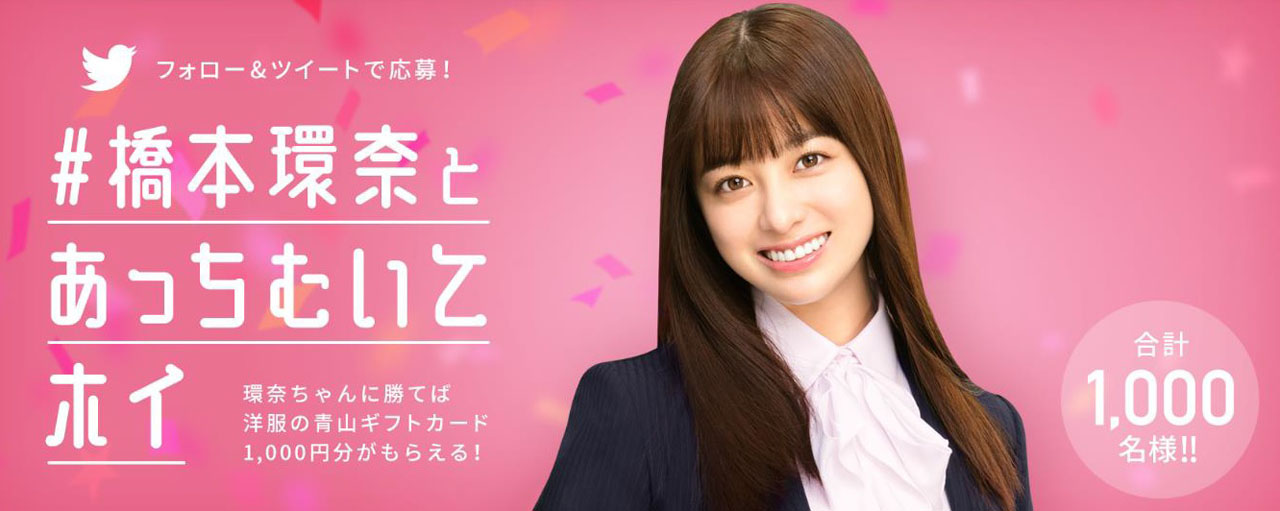 キャンペーン第1弾は、橋本環奈とTwitter上で「あっちむいてホイ」の勝負をし、勝った人、合計1,000人に「洋服の青山ギフトカード」1,000円分をプレゼント。期間中は毎日(1日1回)挑戦することができる。