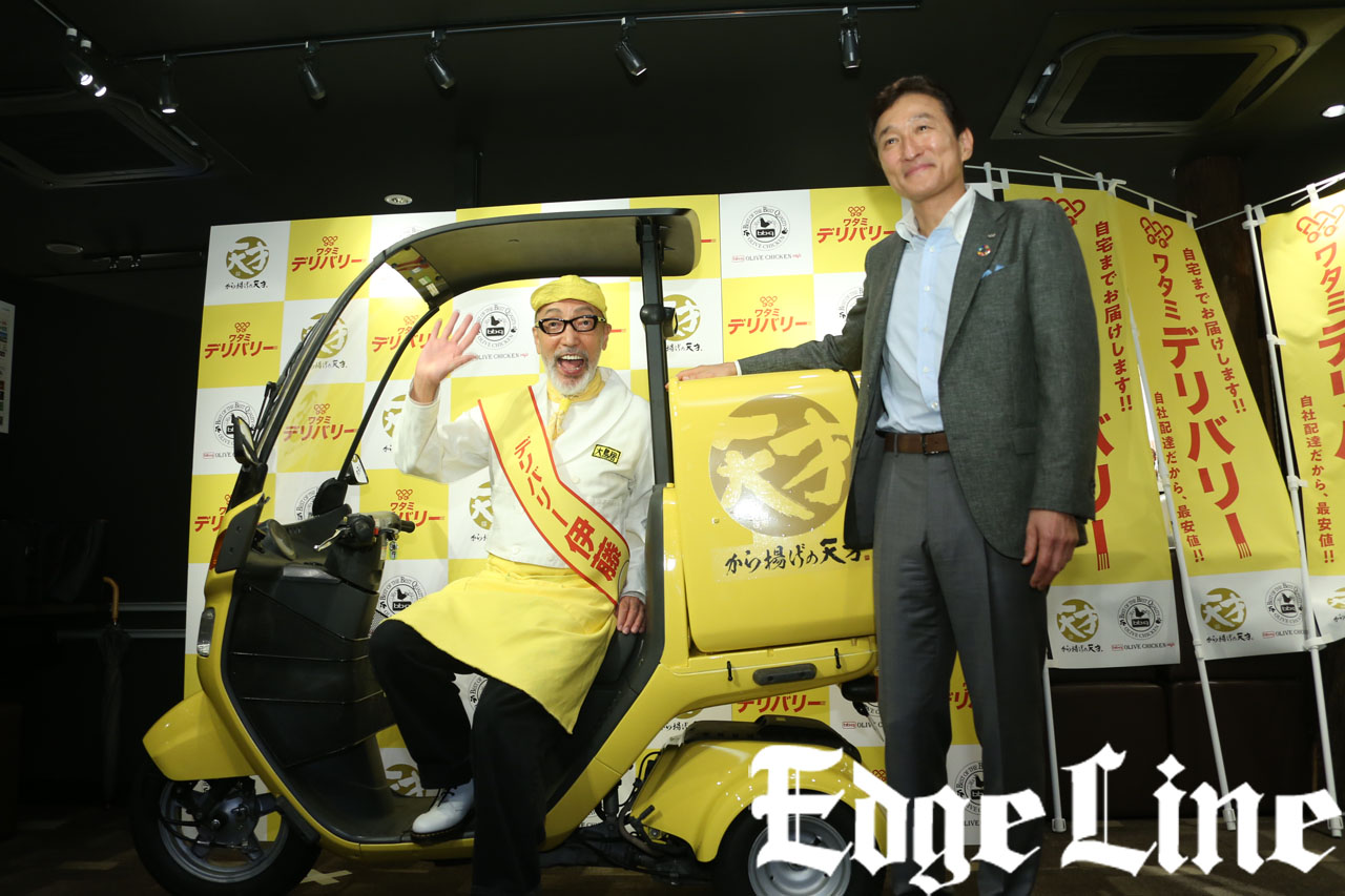 タレント・テリー伊藤(70)、ワタミ株式会社 代表取締役会長兼グループCEO・渡邉美樹氏(60)が22日、東京・大田区のワタミ本社前で自社デリバリー戦略「ワタミデリバリー」事業開始 兼 「から揚げの天才」大鳥居店オープニング 記者発表会に登場した。