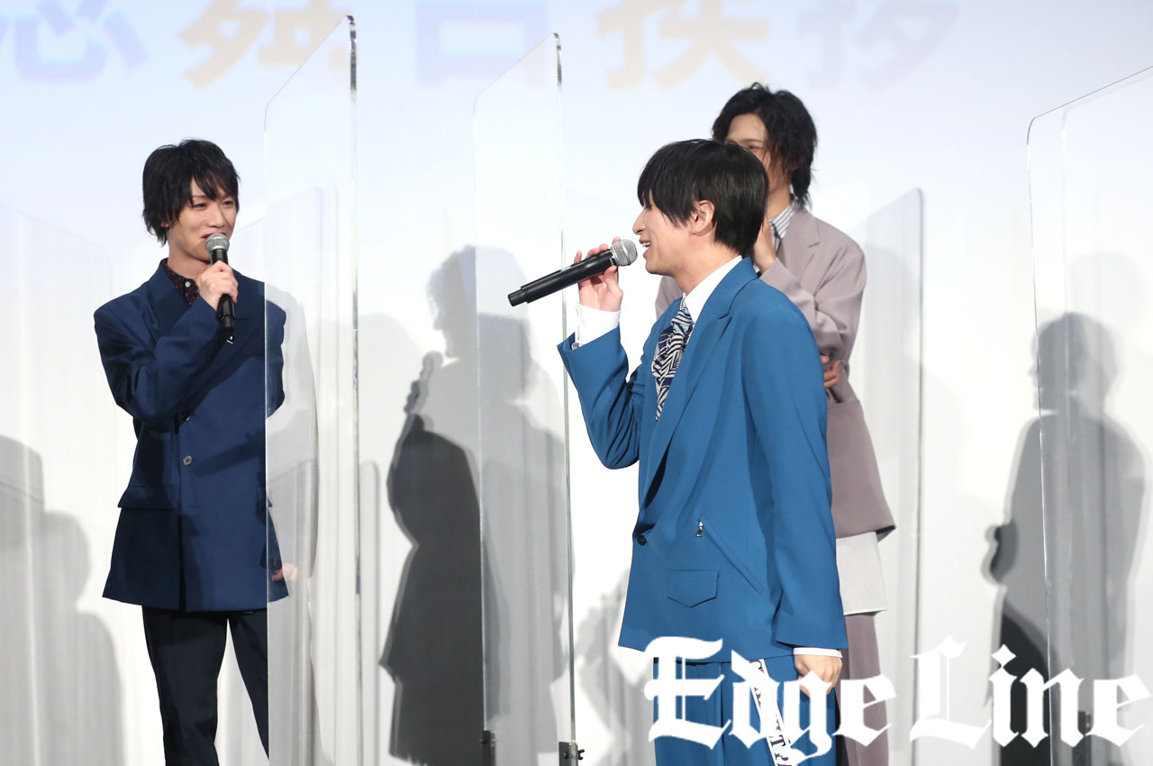 全国160館でライブビューイングされるなか、キャスト陣がラインアップ。ニコニコと手を振るなどしながら、まずは、伏見臣役・稲垣成弥がVTR登場し、いきなり、「どうですか遼太郎」と、まるで見ているかのように赤澤のいる場所をピンポイントで指さして笑いを誘いつつ、赤澤は「なにこれ~(笑)」と言いつつ、話をはじめようとするとスルーされ場内は爆笑。稲垣は植田にも同じように指さしたがこれはハズれたうえ、真面目に場内のことを話そうとする植田を再びスルーして、さらに盛り上がった。