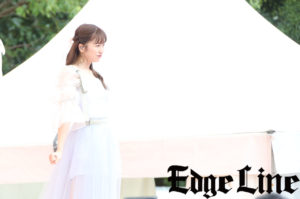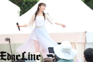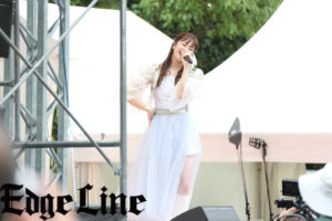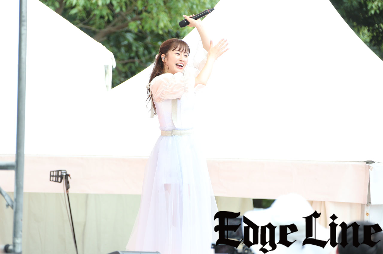 午前9時45分、OVERTUREが流れた後に、パステルカラーのチューブトップドレスに白のシースルーをまとって夏らしい爽やかな装いで登場。楽曲『仕事しろ』から始まり、客席への指さしの振り付けなどで、ファンの気持を掻き立てていく様子が。