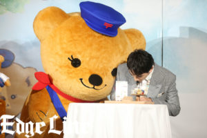 同所で販売もされるオリジナルグッズの腕時計、ハンカチ、そして特注のベストを身にまとい登場した町田。ぽすくまもお出迎えするなか「1年ぶりー」と声をかけると、ぽすくまから町田手を握ったり、ベストへは「上品でお気に入りです」と、笑顔が浮かぶ。