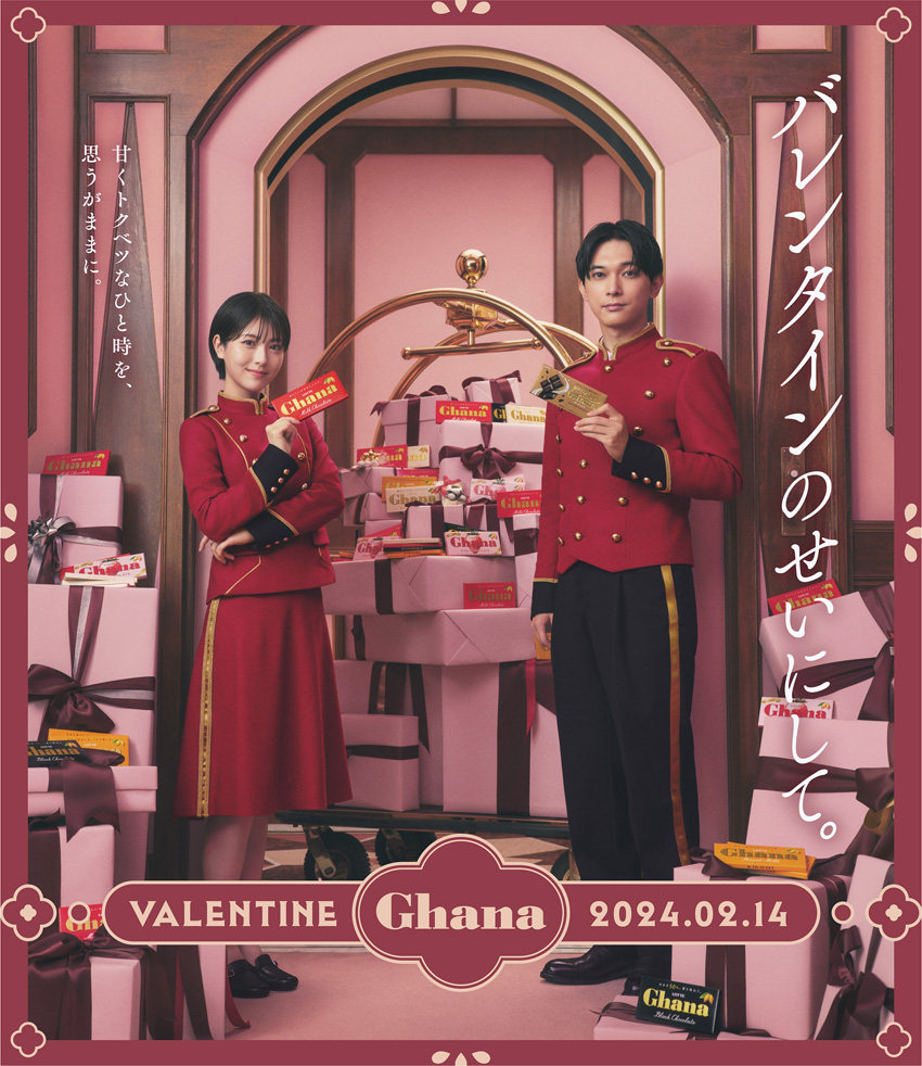 2020年からガーナCMキャラクターを務める2人が今回は優秀なホテリエを演じることとなり、赤地に金ボタンのついた制服を着用していることも見どころの1つ。株式会社ロッテのバレンタインシーズンに向けた企画『バレンタインのせいにして。』。シリーズ3年目の今年のテーマは『Ghana Valentine Hotel』。ガーナがバレンタインの時期だけにオープンする架空のホテルを舞台に、“バレンタインのせいにして”いろいろな過ごし方をしたい客が訪れ、優秀なホテリエの先輩の吉沢と後輩の浜辺がガーナと一緒に望みを叶えていくというストーリーで展開していくもの。