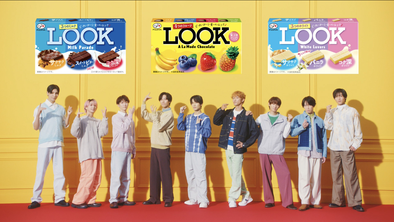 3つめは不二家公式XでのルックのSNSキャンペーン。こちらは、新CMの公開を記念したもので、2024年9月10日午前10時より、不二家公式X(旧Twitter)にて、「9週連続 #どれから食べルック キャンペーン」と題して行われる。不二家公式Xアカウントをフォローし対象の投稿をリポストするだけで、毎週100名様合計900人に「どれから食べルック?詰め合わせBOX」が当たる。さらに、キャンペーン第1弾では、対象のCM動画の合計リポスト数が5万リポストを達成すると、Snow Manのスペシャル動画が公開されるとのこと。詳細は公式ブランドサイト(https://www.fujiya-peko.co.jp/smileswitch/)にて。
