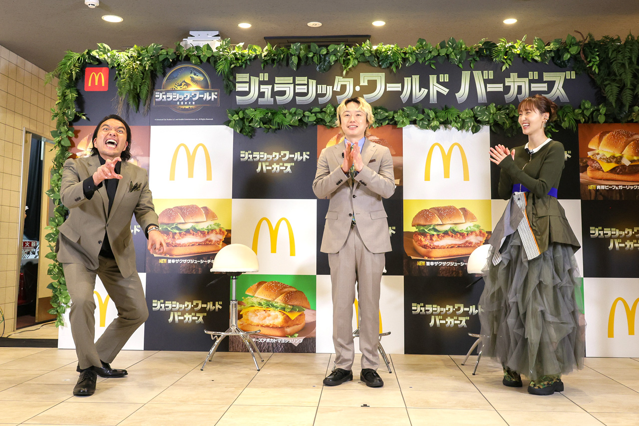 日本マクドナルド株式会社が『ジュラシック』シリーズの最新作『ジュラシック・ワールド/復活の大地』とコラボレーションすることを発表。これにあわせて、恐竜の爪痕をイメージした特製バンズでサンドした『肉厚ビーフ&ガーリックオニオンビーフ』、『旨辛ザクザクジューシーチキン』、『チーズアボカドマヨシュリンプ』の3種類を『ジュラシック・ワールド バーガーズ』として、さらに『ジュラシック』シリーズの世界観から着想を得て開発された、バーガーとも相性抜群な『マックフィズ/マックフロート パイナップルメロン』をそれぞれ6月18日より全国のマクドナルド店で期間限定発売する。