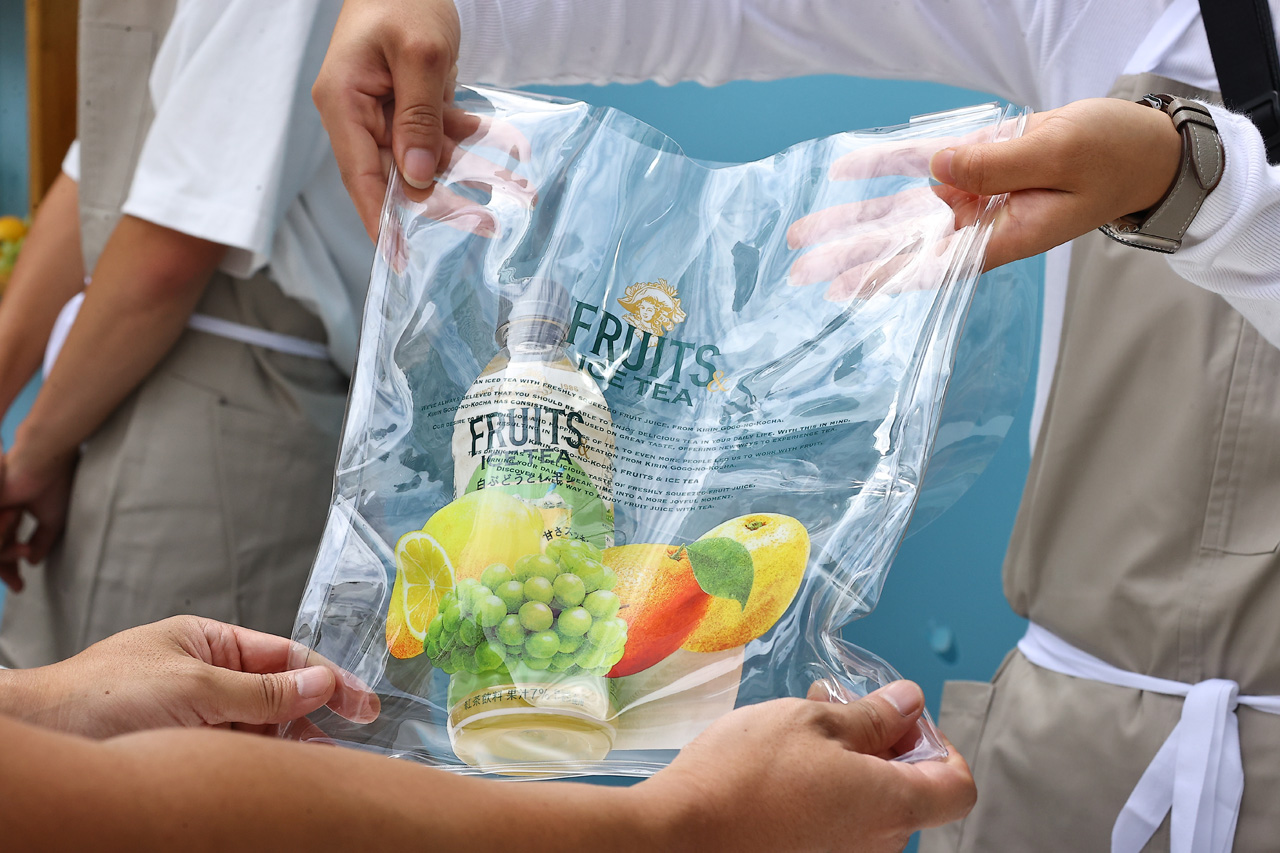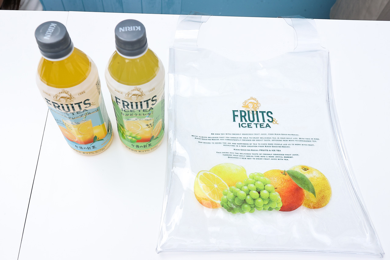 会場では『午後の紅茶 FRUITS & ICE TEA オレンジとグレープフルーツ/ 白ぶどうとレモン』いずれかと、『午後ティーフルーツバッグ』を配布。 「午後ティーフルーツバッグ」は本イベント限定のオリジナルデザイン(1種)となり、数量限定・本イベント限りの配布となる。なお本イベントで配布するクリアバッグは、現在展開中の『5つのデザインから選んで、その場で当たる!午後ティー フルーツバッグ キャンペーン』でプレゼント予定のアーティスト・イラストレーターとのコラボレーションデザインではなく、オリジナルデザインになっている。