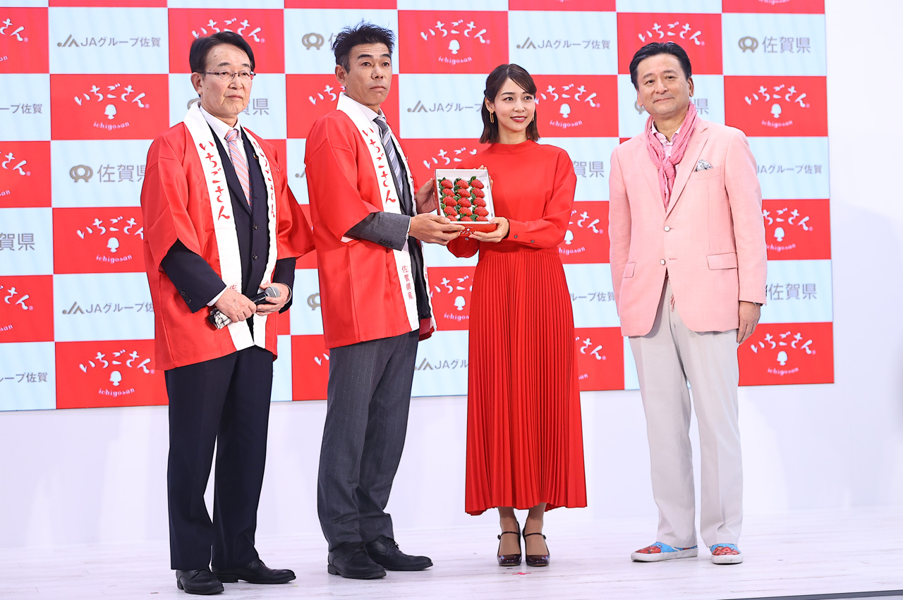 「真っ赤なみずみずしさを表現してみました」と、相武は“いちごさん”の赤色をイメージしたドレス姿で会場に姿を見せる。