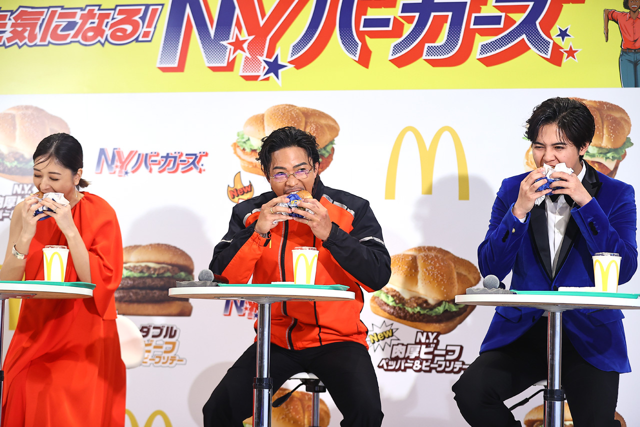 その後、マクドナルドでアルバイト経験があるという数原が2人に新商品を“かっずデリバリー”(聞いたまま)して新商品を振る舞う様子も。3人とも新商品を食べた後に、「んんん♪」と、とにかく美味しそうな笑顔を浮かべて、その魅力を伝える。とくに夜マック限定の『N.Y. ダブル肉厚ビーフ ペッパー&ビーフソテー』を食した際に、数原は「うまみに溺れそうになりました」といえば、片寄は「夜の特別感があっていいですね。通常のものと両方楽しめそうです」とアピールしていた。