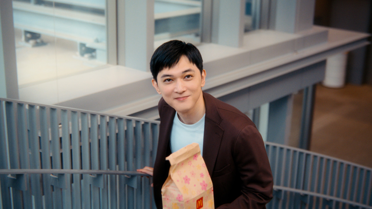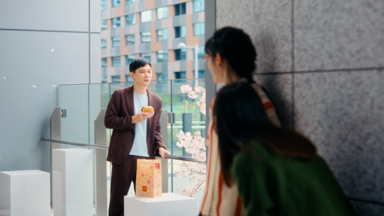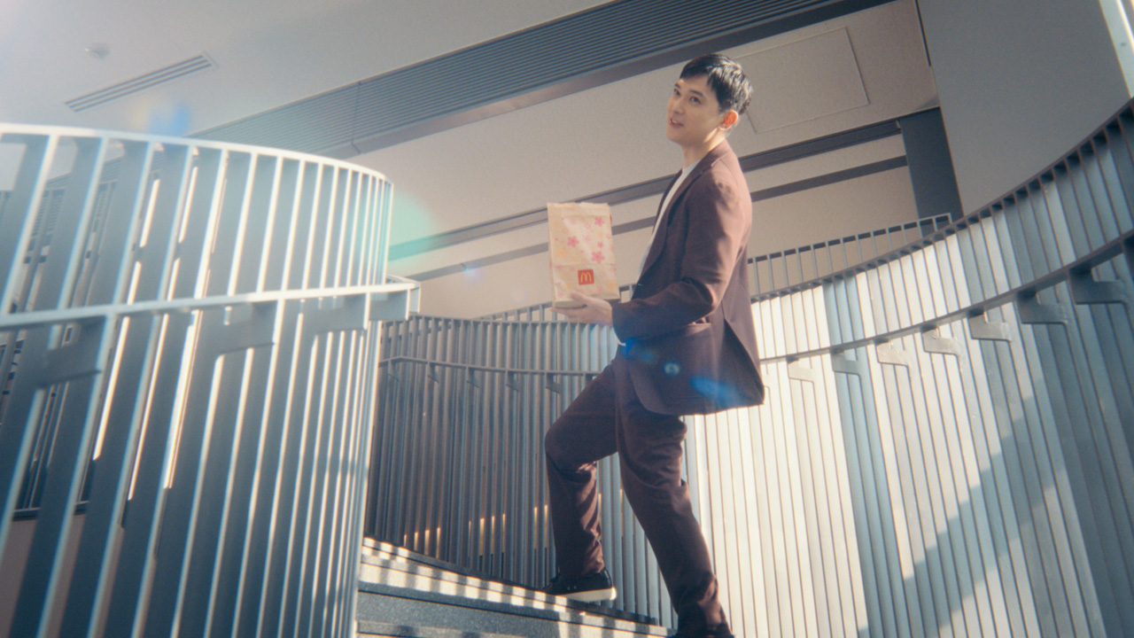 マクドナルドで「コク旨かるび焼肉風てりたま」をテイクアウトし、オフィスビルのテラスへ向かうシーンでは、螺旋階段をスタスタと駆け上がる軽快なフットワークを披露。階段の途中でばったり出会った俳優・野内まる演じる後輩とすれ違う場面でも、短い会話を交わしながらカメラの横をスッとくぐり抜けていくスマートなアクションを見せる。「てりたま買ってウキウキですね」と後輩に声をかけられるカットでは、監督から「ウキウキ感がにじみ出るような表情でお願いします」とオーダーされ、ちょっと照れくさそうな表情を見せつつ、はにかむような笑みを浮かべ、しっかりOKテイクを獲得していた。