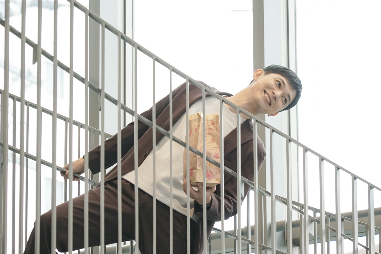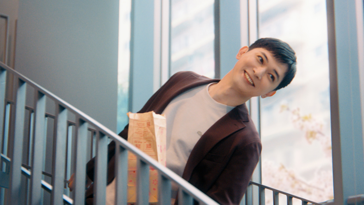 「てりたま」を買ってウキウキしている…と思いきや、実は第2弾メニューの「コク旨かるび焼肉風てりたま」を買って“ウッキウキ”している気持ちをアピールするシーンで、吉沢が考えた表現方法は、手すりにつかまって身体を大きく反らせるアクション。吉沢といえば、昨年公開された主演映画『国宝』が記録的な大ヒット作品となり「すごく嬉しくてウキウキした」と気持ちを明かしていたが、このシーンでも、その気持ちに迫るような喜びを大胆な動作をまじえながら表現。周囲から驚きの声が漏れるなか、吉沢はしっかり安全を確保しつつ、決めポーズで現場を盛り上げていた。