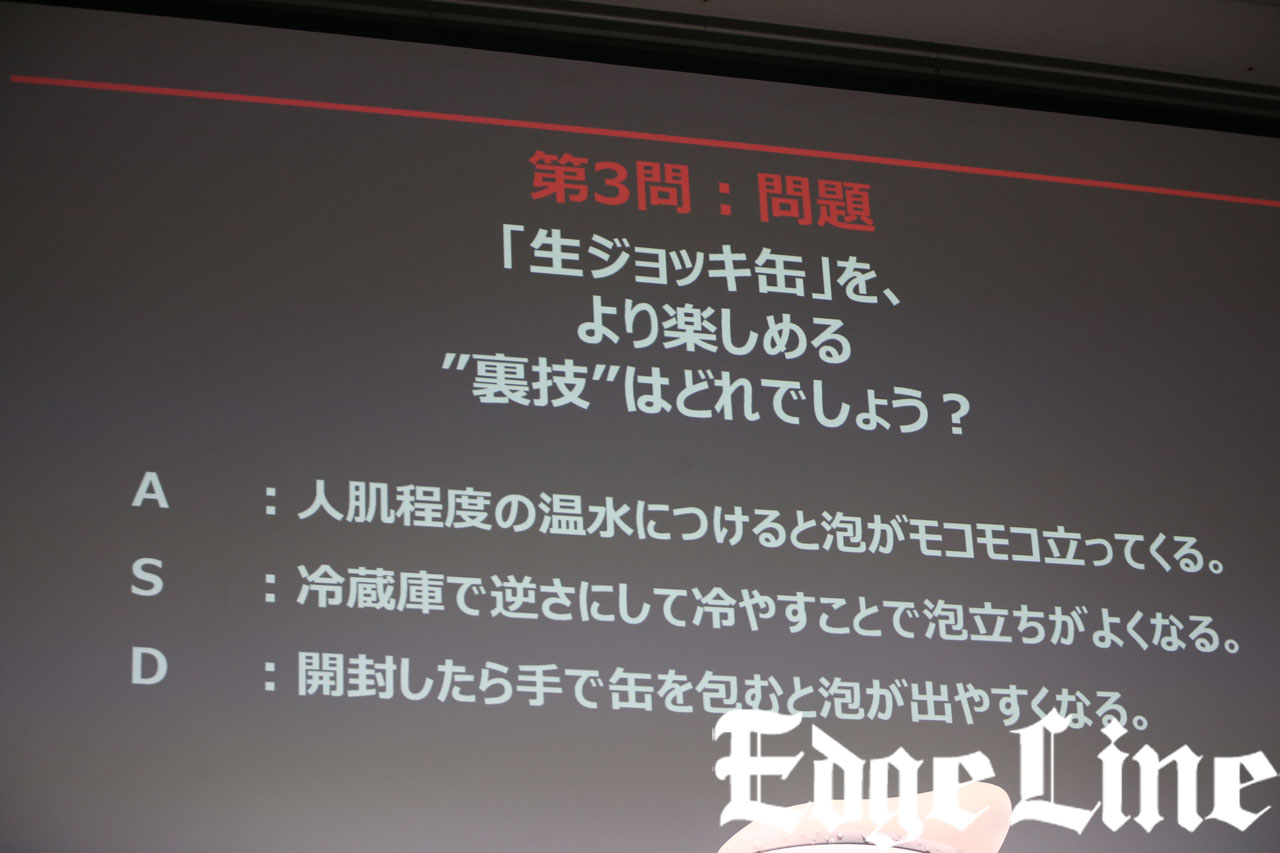 鷲見アナ:第3問「生ジョッキ缶」をより楽しめる裏技は?A・人肌程度の温水につけると泡がモコモコ立ってくる。S・冷蔵庫で逆さにして冷やすことで泡立ちが良くなる。D・開封したら手で缶を包むと泡が出やすくなる。のどれでしょうか。