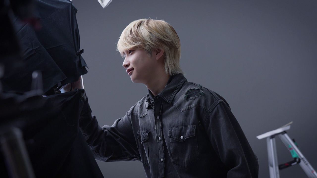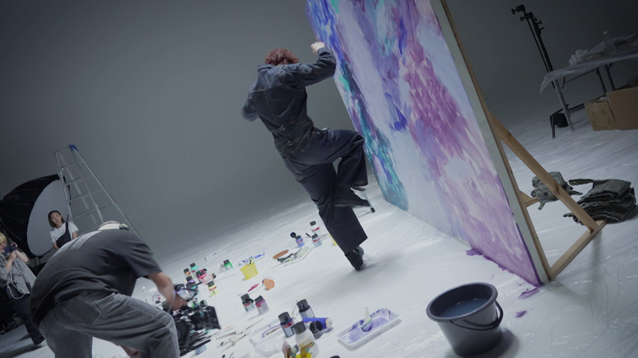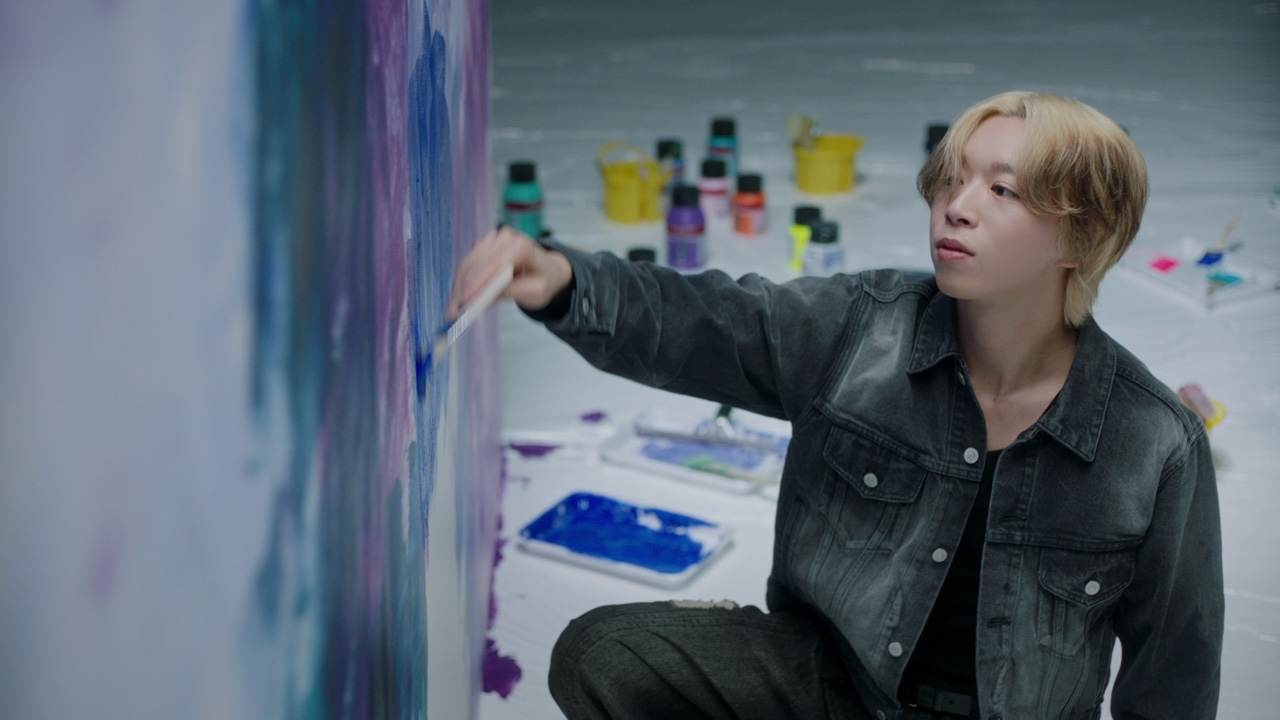 撮影では、鈴木氏のアドバイスや制作サポートを受けながら、MANATOが真っ白なキャンバスに、刷毛で最初の一筆を描いてスタート。続いてSHUNTOが登場。静かにキャンバスを見つめていたが、筆を走らせていくうちに段々と笑顔になり、水色や紫のペイントで大胆に彩っていく。LEOも元気いっぱいに登場。画材や技法に興味津々な様子で「めちゃ楽しかったです」と笑顔を見せていた。SOTA、RYUHEIはキャンペーンソングである『Secret Garden』のリズムに合わせて、身体全体を揺らしながら描いていく。最後にJUNONが現れ、カメラに向かって一筆を加えた。