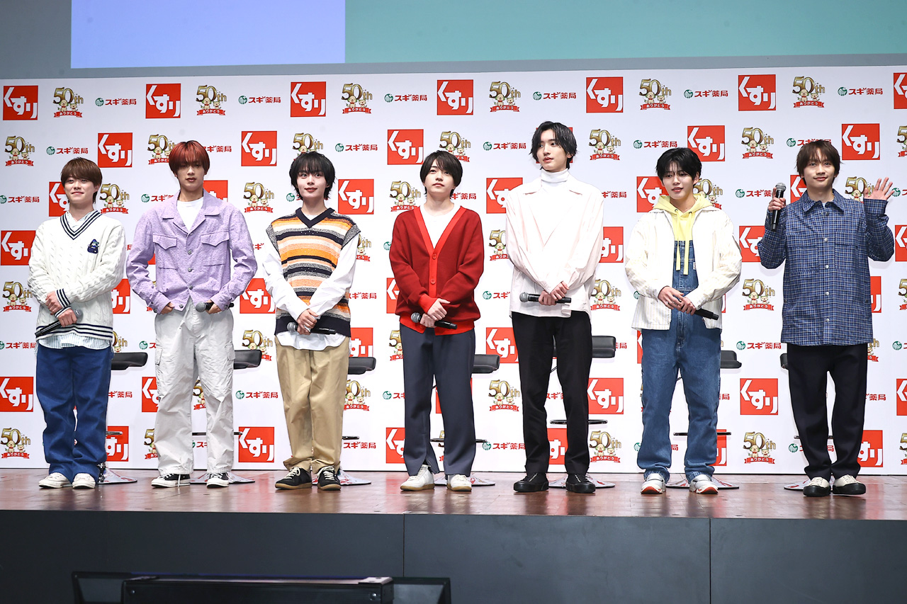 CMと同じ衣装で登場したメンバーたち。今回の起用に大橋から「嬉しい気持ちと、僕たち『なにわ男子』も50周年……」と思わず口がスベって、他のメンバーから総ツッコミが入るなか気を取り直して「僕たち『なにわ男子』も5周年ということでスギ薬局さんの50周年と縁を感じているので、僕たち精いっぱい頑張ります!」と、行こごんだ。