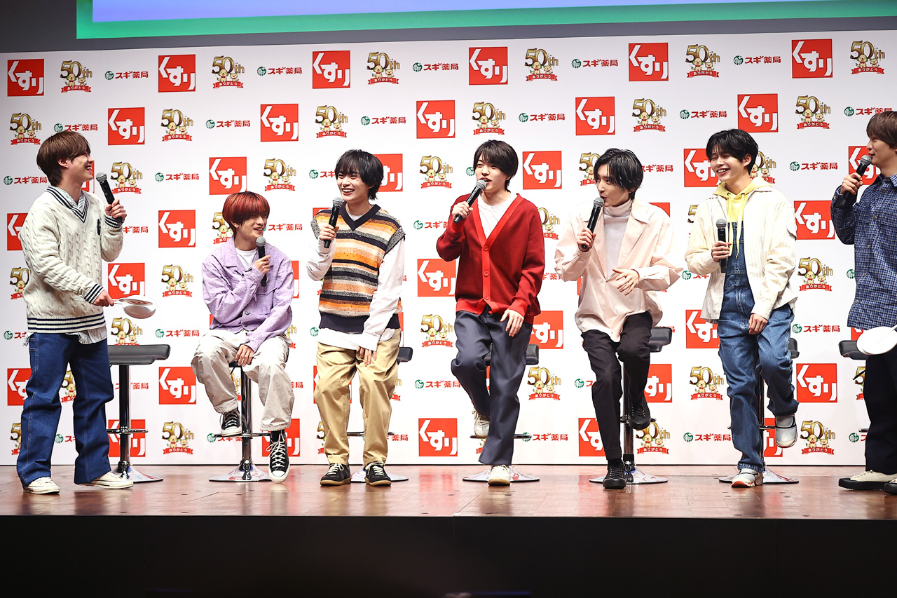 アイドルグループ『なにわ男子』西畑大吾、大西流星、道枝駿佑、高橋恭平、長尾謙杜、藤原丈一郎、大橋和也が1月28日に都内で『スギ薬局50周年 新CM発表会』に登場した。