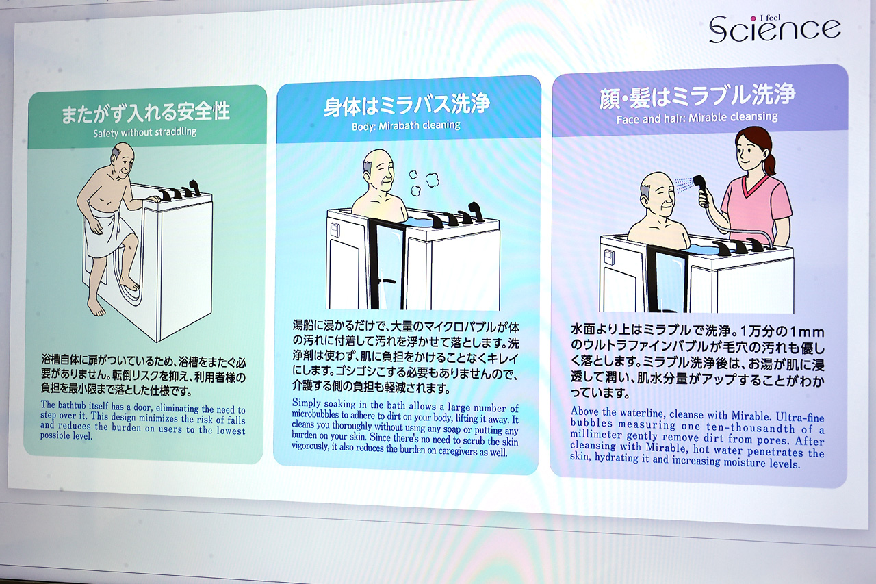 前倉取締役からは、サイエンスのビジョンとして、ファインバブルの技術で社会課題の解決を目指している会社であることや、『ミライ人間洗濯機』もその技術利用の一環で生まれたと話す。、家庭用のシャワーヘッド販売はもちろんのこと、火災現場で活動した消防士の防火衣等に付着する有害物質や煤(すす)を洗い流すために開発した機器も、自治体への導入が進んでおり、社会課題の解決に貢献しているという。