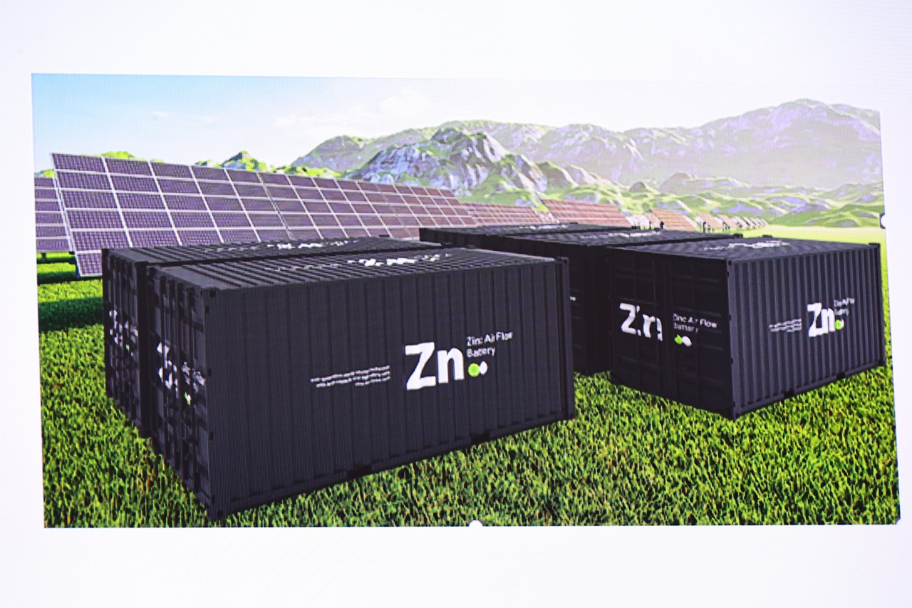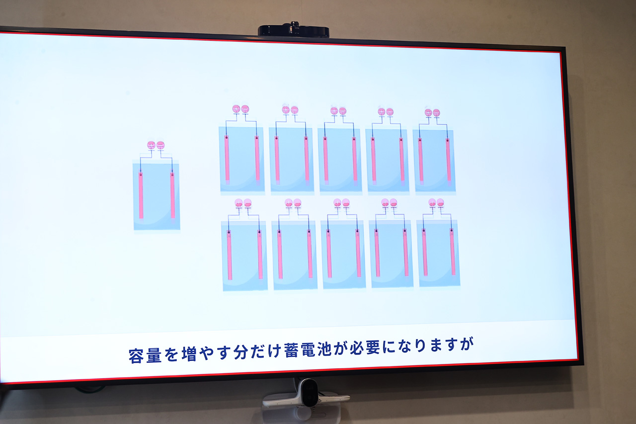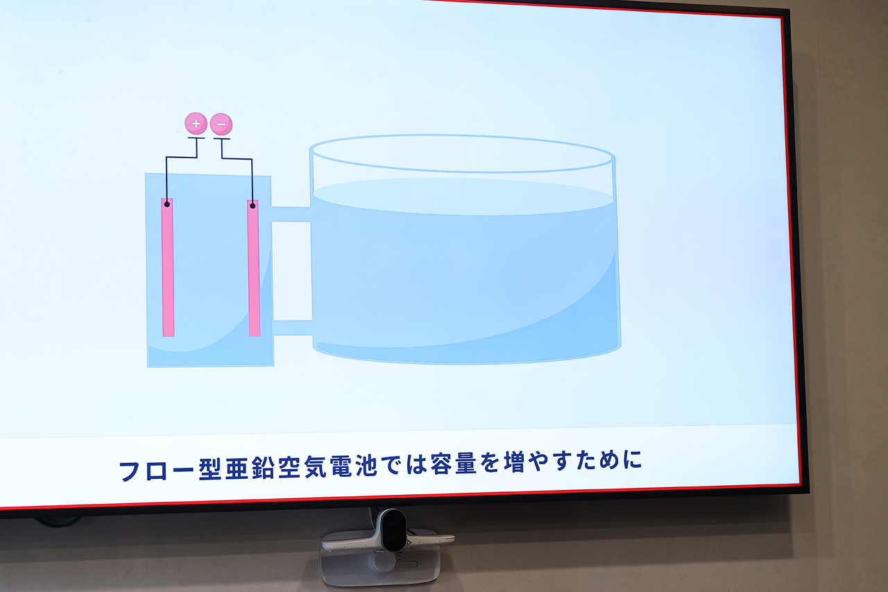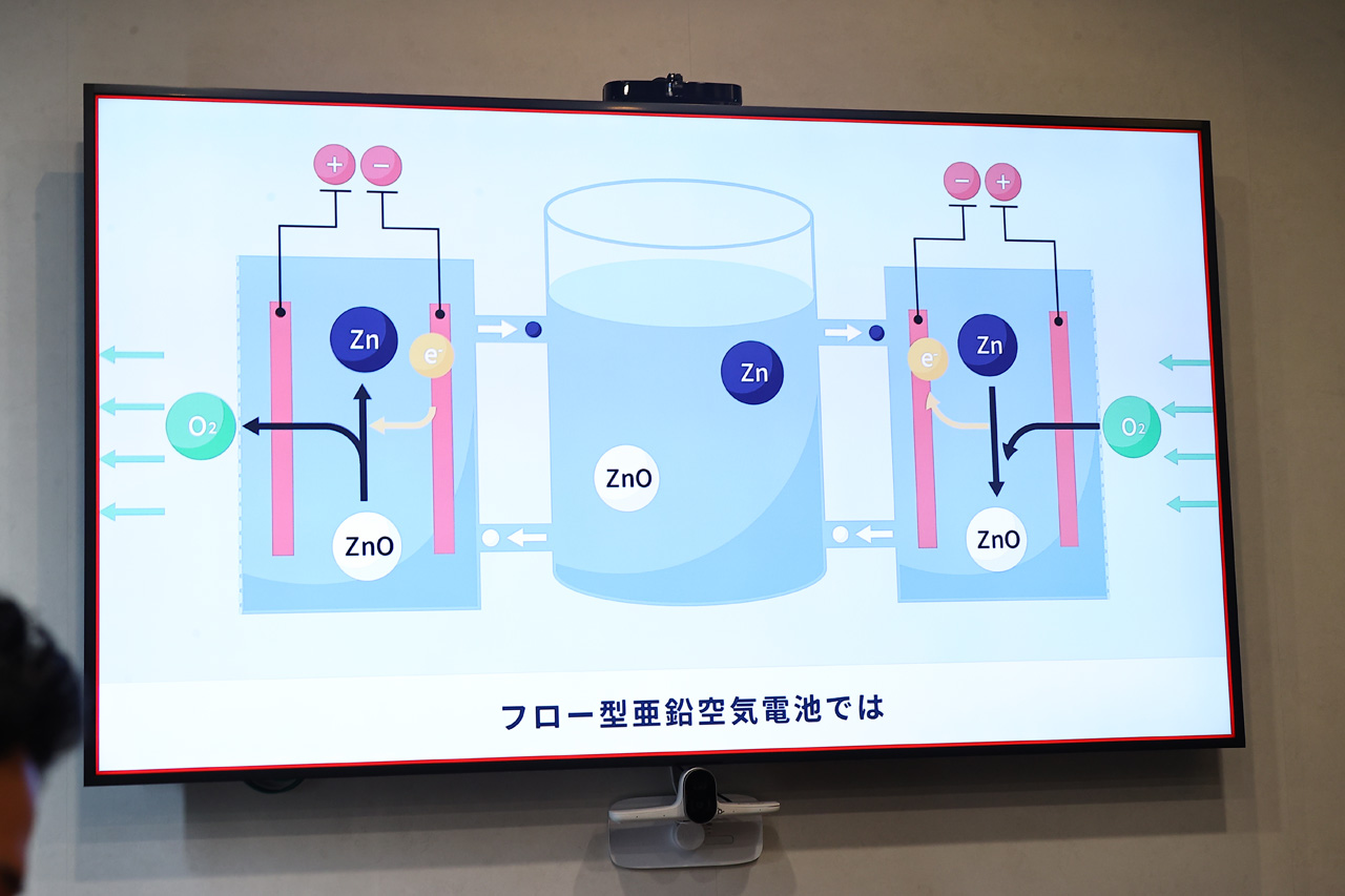 2つ目は、フロー型亜鉛空気電池技術では蓄電池の充放電を担うセルと蓄エネルギー物質の貯蔵部の電解液タンクが各々独立した構成で、この蓄エネルギー物質の電解液タンクを大きくすることで大容量の蓄電ができるという。これにより、これまで蓄電池を大量生産して蓄電していたものが、コストダウンを見込めるという。