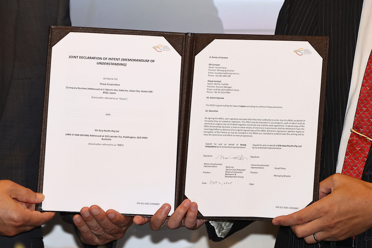 大手電気機器メーカー『シャープ株式会社』とオーストラリア・クィーンズランド州のエネルギー企業『エネルギー・ストレージ・インダストリーズ・アジアパシフィック』(ESI)が10月2日に大阪・関西万博内のオーストラリアパビリオン内でフロー型亜鉛空気電池技術の共同開発に関する覚書(MOU)を締結した。