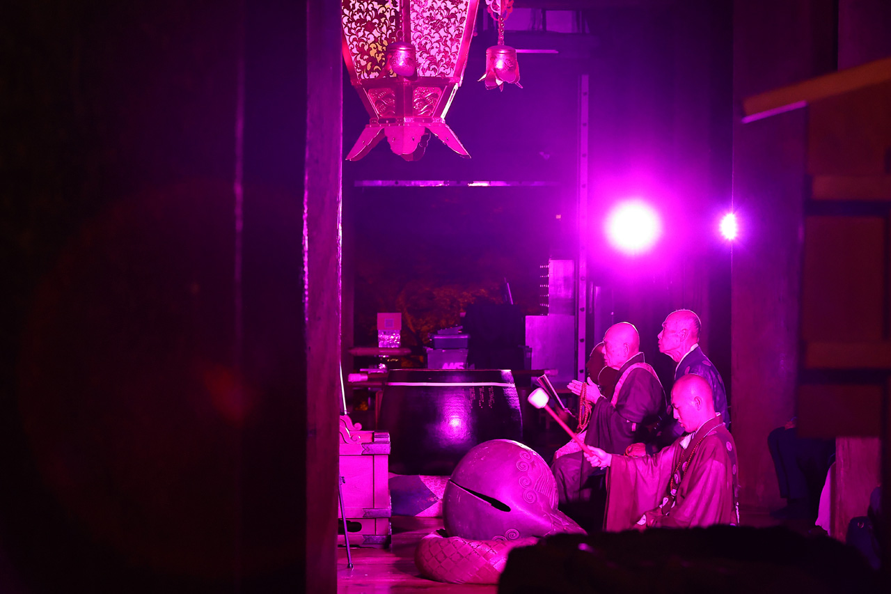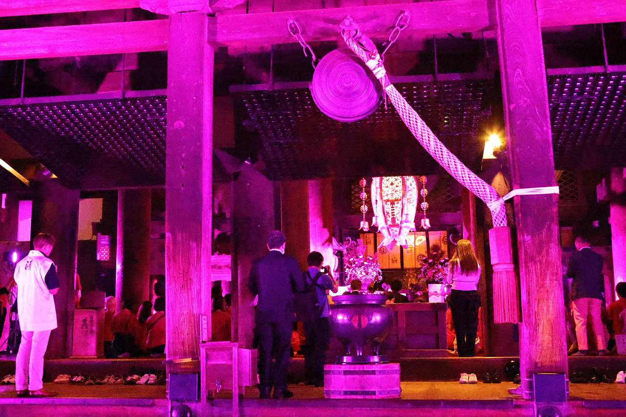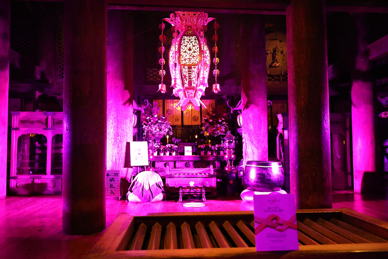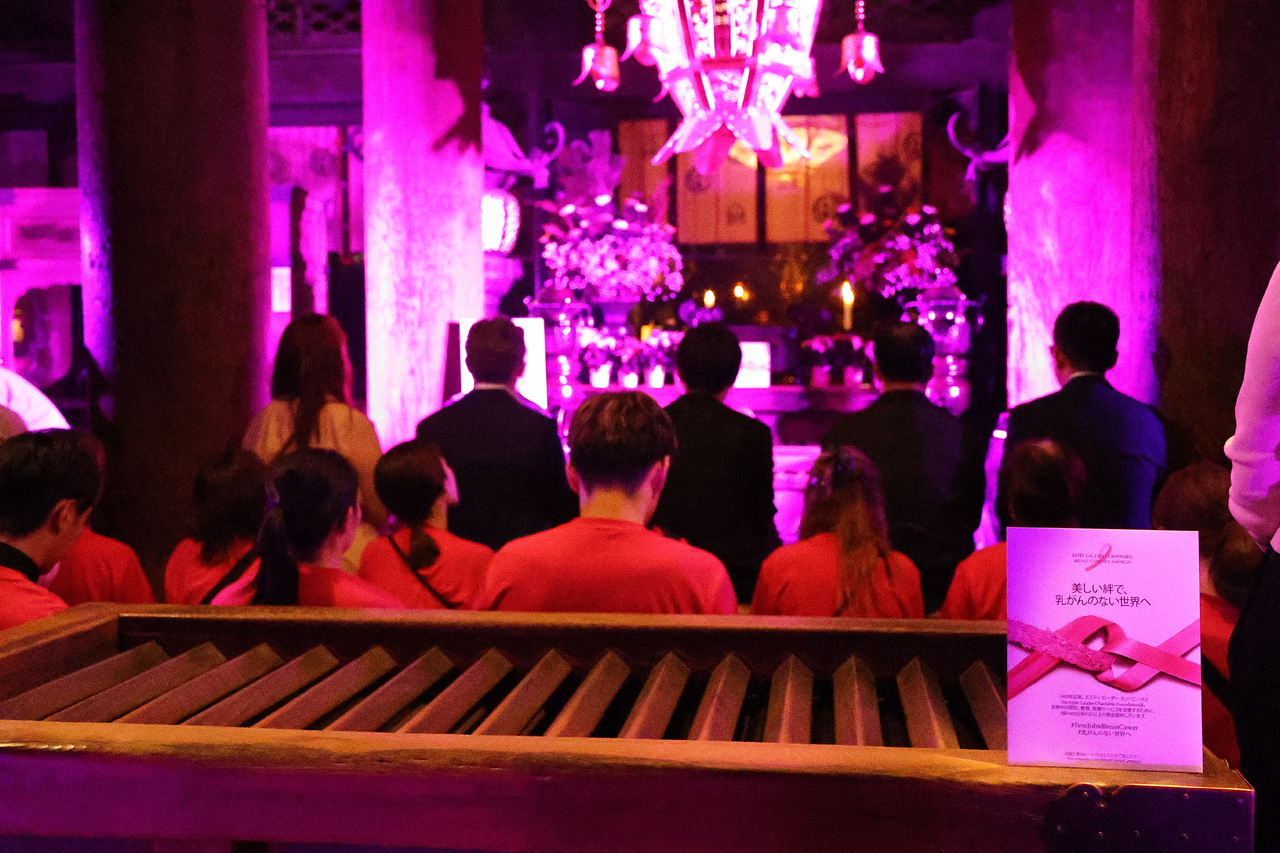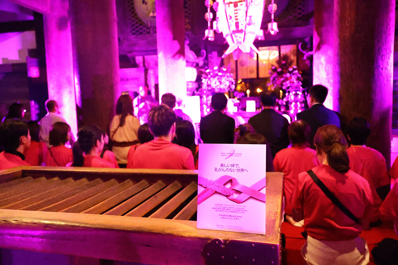 午後7時前に本堂外陣、本堂舞台上、観音慈光、西門階段がピンク色に彩られる。さらに本堂外陣では、乳がんで亡くなられた方々への鎮魂として、関係者含め約40人が参加する『乳がん犠牲者追善供養「観音経」読経』も行われた。