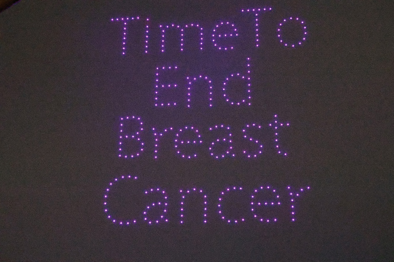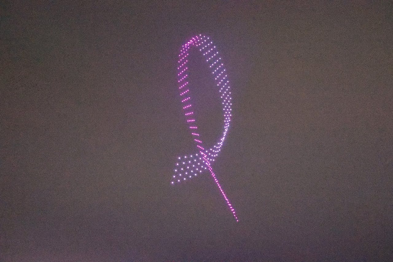 そして午後7時、360機のドローンが夜空へとあがっていき、隊列を組んでいく。まずは、キャンペーンシンボルであるピンクリボンのマークから始まり、ハートのモチーフのほか、「Time To End Breast Cancer」「#乳がんのない世界へ」などのメッセージを夜空に浮かばせるものとなった。