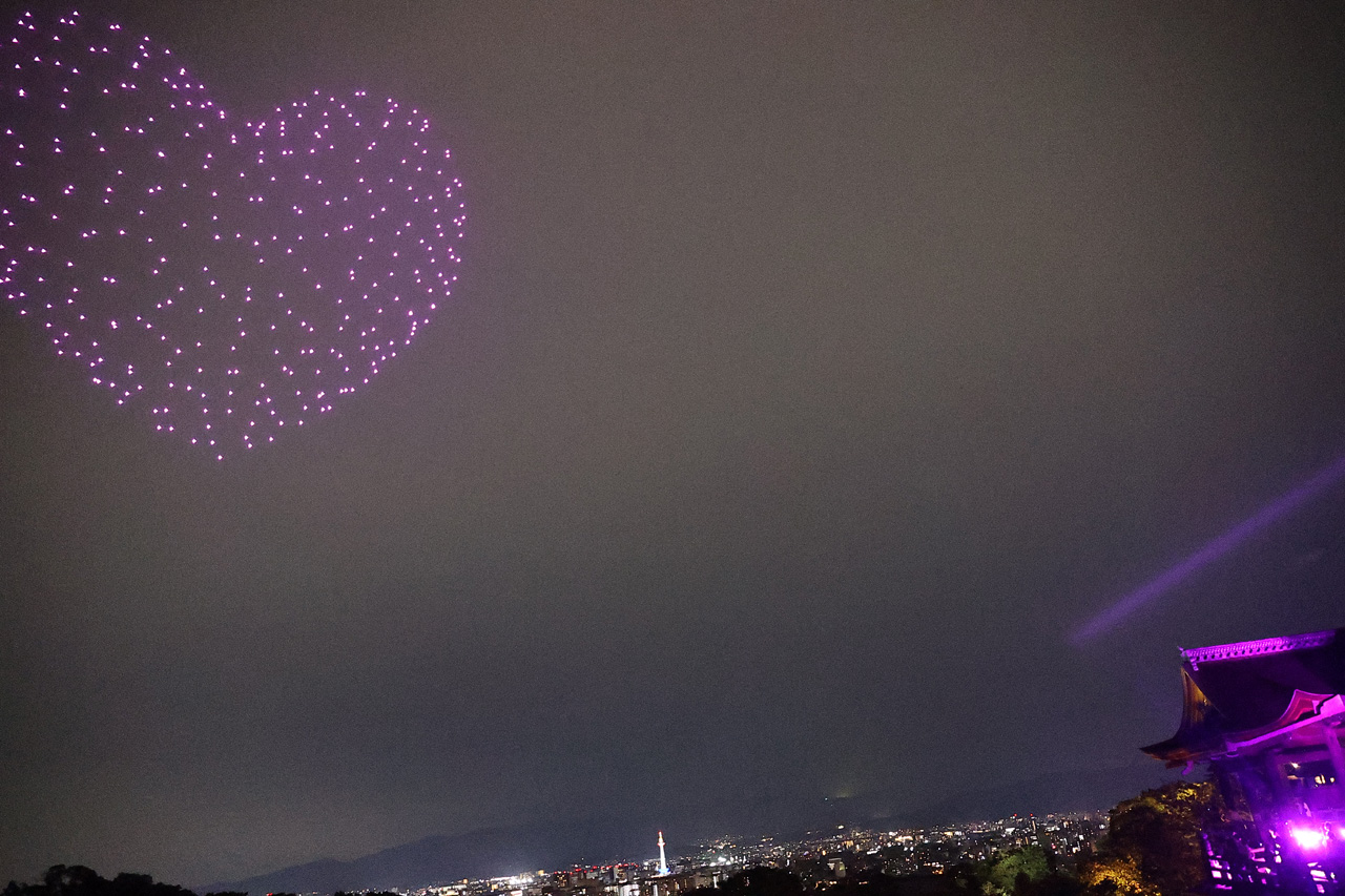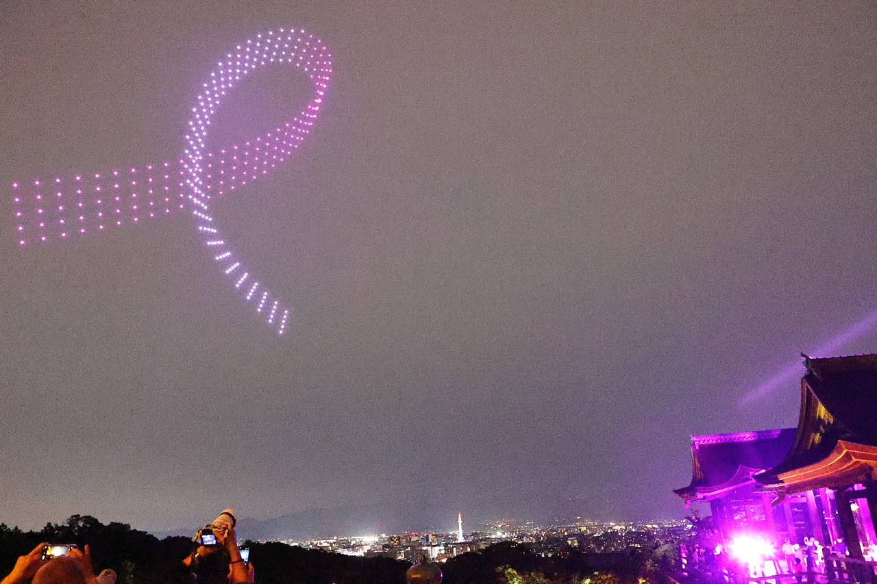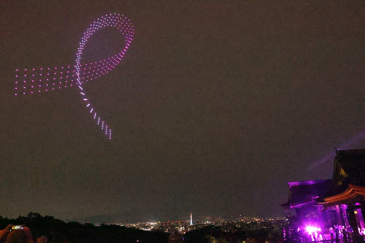 京都・清水寺 乳がんない世界へ願いを込め……ドローン360機でピンクリボンマーク15