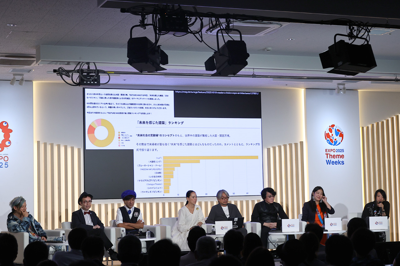 落合氏はシグネチャーパビリオン『null²』(ヌルヌル)を担当。「ポイントはどこかというと、話題という観点ではシグネチャーパビリオンは大屋根リングに負けたという結論です。誰も戦えてない。やっぱりリングが強いですよ」と、データを見せながら“敗北”を宣言したが、宮田氏が冷静に「争いじゃないんで!」とツッコむことも。あまりの率直さにギャラリーからは笑いが起こっていたが、そのリングに一矢報いたのが『未来を感じた建築ランキング』というものだそうで、そこは「リングに勝った、やった!」と、喜びを口にする。