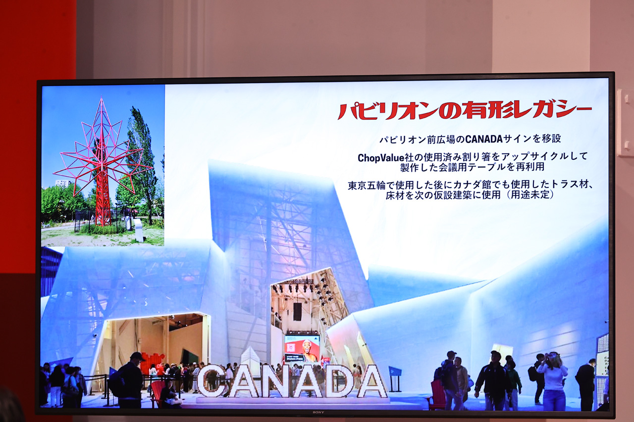 カナダパビリオンの今後について、現時点で用途未定ながら、『パビリオン前広場の「CANADA」サインの移設」、「ChopValue社の使用済み割り箸をアップサイクルして製作した会議用テーブルを再利用」「東京五輪で使用した後にカナダ館でも使用したトラス材、床材を次の仮設建築に使用」することもアナウンスした。