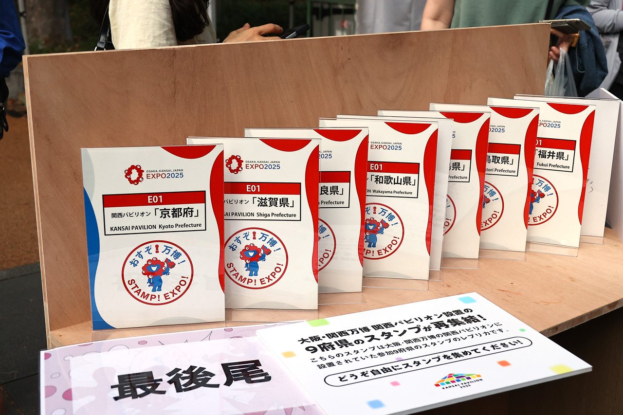 そのなかでホームページに掲載されている地図にはなかったが、大阪・関西万博内にあった、関西パビリオンの出展も。スタッフの近くでは、関西パビリオン内で実際に押せたというスタンプをこの場で押すことができる企画も行ったそう。絵柄は関西パビリオン内のものと同じだったそうだが、スタンプの色を変更しアクセントをつけたという。しかし、公園をはみ出てなにわ筋の歩道まであふれそうになってしまったことから、途中で中止となったそう。なお、関西パビリオンのスタッフの方はこれからも万博の関連するイベントには参加したいと意気込んでおり、囲んでいたギャラリーからも拍手が起こっており“関西パビリオン”はまだまだ楽しめるものになりそうだ。