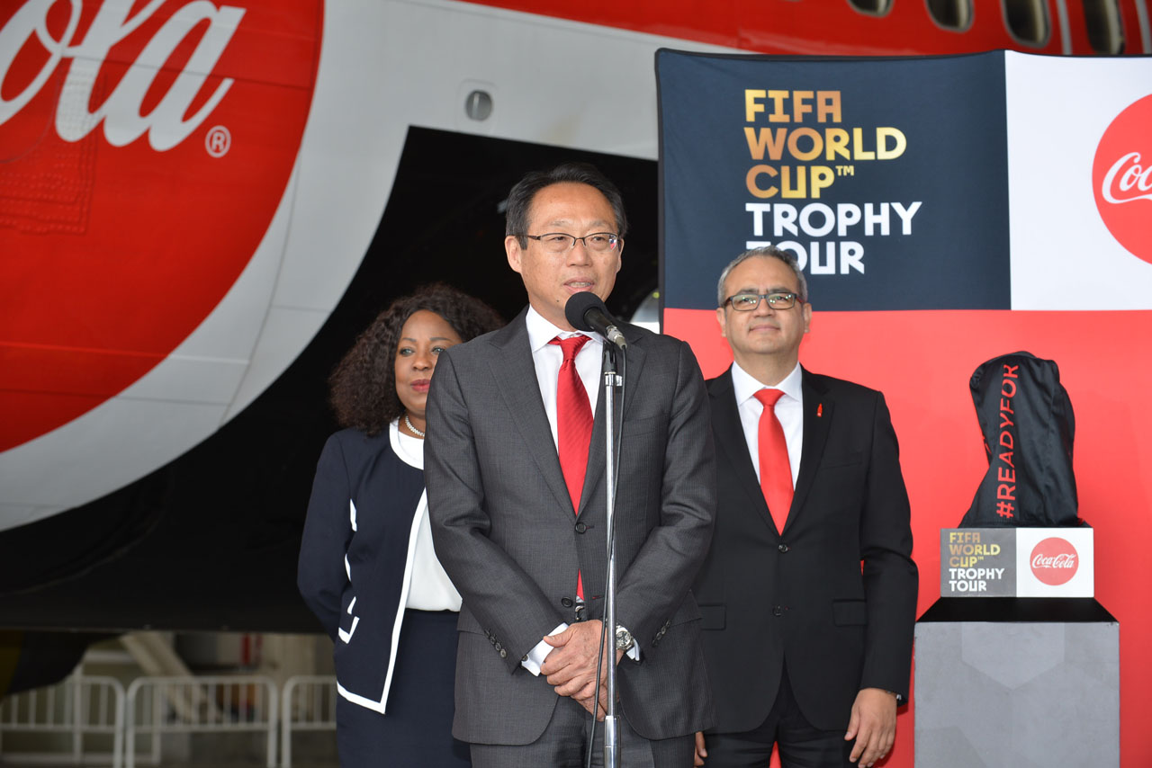 シウバ氏は「日本をはじめとした世界中のサッカーファンのみなさま、この『コカ・コーラ FIFA ワールドカップトロフィーツアー』を楽しんでもらいたいです」と呼びかけたり、田嶋氏は、「私たち日本サッカー協会にとって、オリジナルトロフィーは“夢”、“目標”です。日本の選手が 120%の力を出せるよう、サッカー協会では日々サポートしています。2018FIFAワールドカップロシア大会が成功すること、日本がオリジナルトロフィーに一歩でも近づくことができることを祈っています」と、メッセージを。