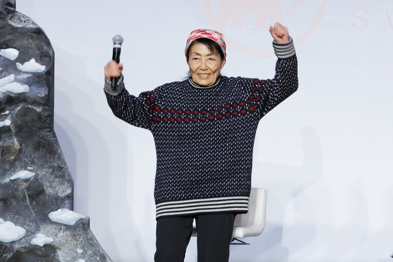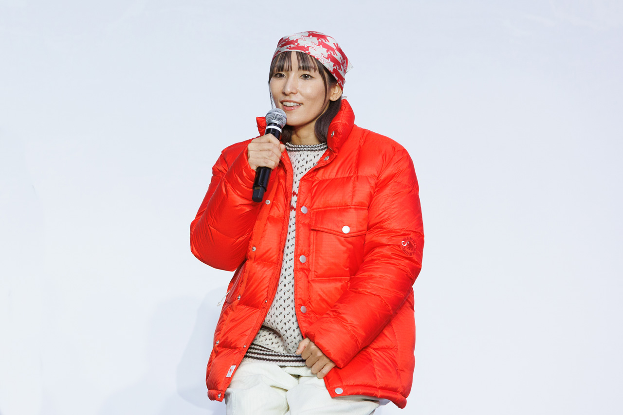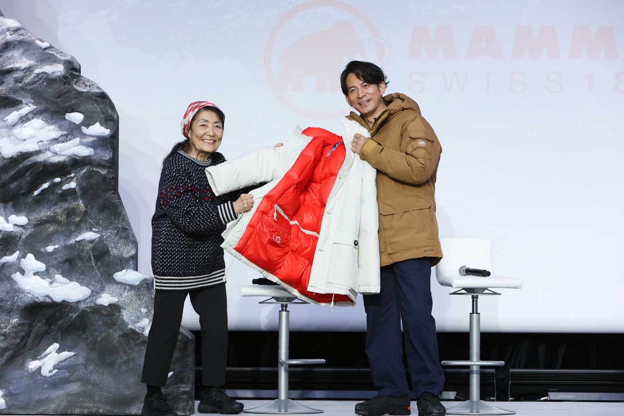 続いては、1969年に日本登山隊としてアイガー北壁を登攀した登山家で医師の今井通子さん、そしてマムート・アスリートでスポーツクライミング界を代表する小林由佳氏が登場し、ファッション・イノベーションの紹介。岡田さんと今井さんは、過去の映画舞台挨拶以来、9年ぶりの再共演となりました。今回の今井さんの登場は、マムートとイギリス発のファッションブランド「ナイジェル・ケーボン」とのコラボコレクションのテーマが、今井さんも参加した1969年日本登山隊のアイガー北壁直登ルート「ジャパン・ディレティシマ」から着想を得ており、当時の挑戦を振り返る特別なトークが繰り広げられました。また、これを機会にマムートが作成した1969年の日本隊による直登ルート登攀をイメージした12分間の短編映画のダイジェスト版が披露されました。今井さんは「こうしてマムートのイノベーションによって生まれ変わるのは感慨深い。当時の面影を残しながら、新しい素材を使用したこのコレクションを多くの方に楽しんでいただき、より多くの方が登山に興味を持つきっかけになればと願っています」とコメントしました。小林さんも「アスリートとしても、このコレクションは挑戦心を刺激してくれるコンセプトとデザインだと感じます」とコラボレーションコレクションをアピールしていました。
