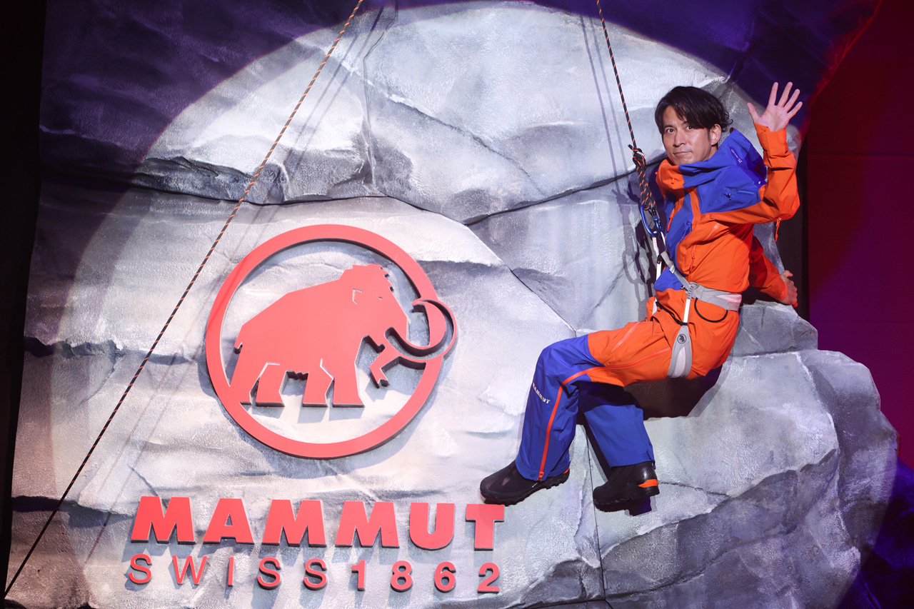 誕生から30周年を迎えたマムート最高峰のコレクション「アイガー エクストリーム」から登場した第6世代となる新作「アイガー ノードワンド プロ ハードシェル フーデッド ジャケット」を着用し、会場に設置された高さ約5mの「アイガー北壁」を再現した特別セット最高部から、岡田さんがロープをつかい懸垂下降で登場。