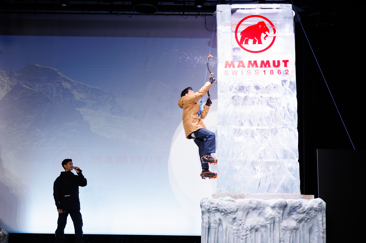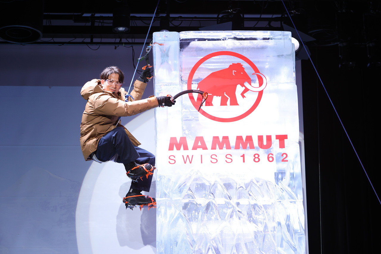 会場内にはスイスの名峰「アイガー」の北壁を再現した特別セットに加え、本物の氷を使用した高さ約4.5メートルの氷壁(アイスクライミングウォール)を設置し、2025 年秋冬コレクションを構成する3つのマムート・イノベーション(テクノロジー・イノベーション、ファッション・イノベーション、アーバン・イノベーション)の新作を披露した。