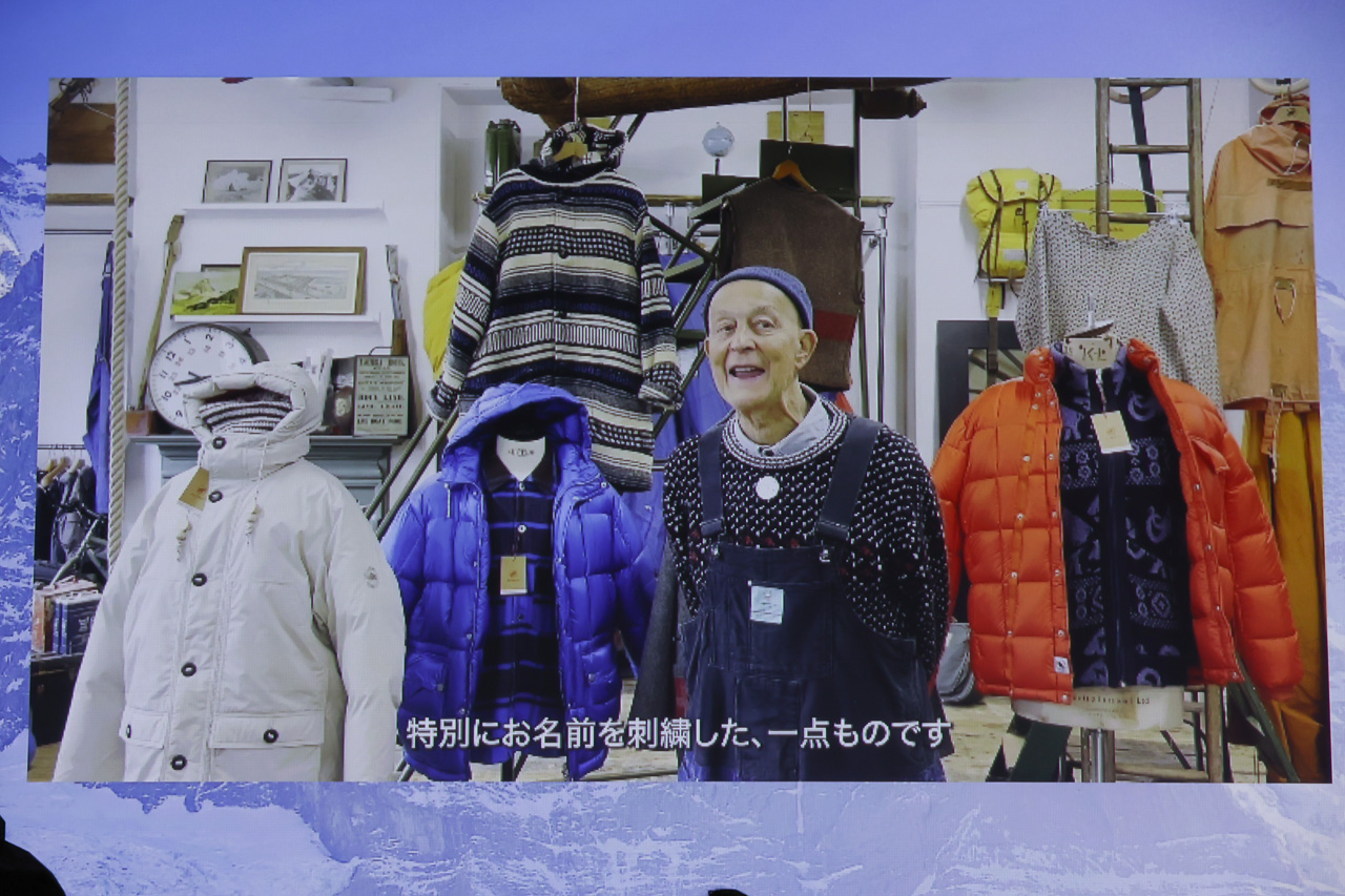 発表会では、今回のコラボレーションを手がけたデザイナーのナイジェル・ケーボン氏から岡田さんへ特別にビデオメッセージが上映されました。ナイジェル・ケーボン氏は、「このインスピレーションは、1969年の日本の登山隊がアイガー北壁に挑んだことから得ました。マムートとこのコレクションはとても刺激的で、素晴らしい商品です」とコラボレーションモデルの魅力を語りました。その後、岡田さんの名前の刺繍が施された特別仕様のコラボレーションアイテムも贈呈され、今井さんから岡田さんへ直接手渡される場面も。岡田さんは、「本当にうれしいです!今井さんの過去の挑戦に対してのイノベーションが反映されたコレクションということで、これから自分自身が何かに挑むときに着用させていただきながら、一緒に挑戦していきたいと思います」と感慨深げにコメントしました。