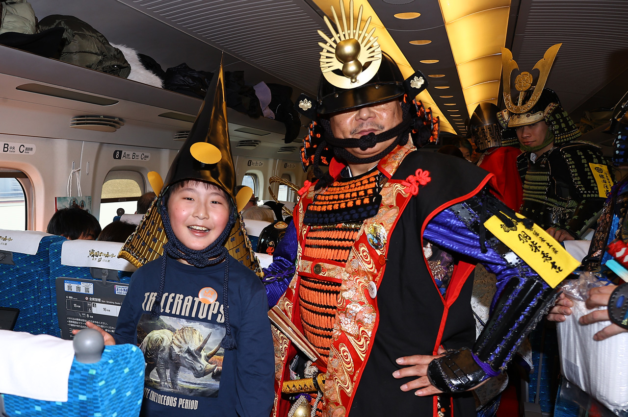午前11時40分、子ども含む3人×7組の合計21人が品川駅から東海道新幹線ひかり641号の16号車へと乗り込んでくる。車内には安土城時代の信長公と有力武将・姫達で構成され約15年ほど前から活動しているという近江八幡市公認の武将隊『信長隊安土衆』から織田信長、織田信忠、寧々、豊臣秀吉、丹羽長秀、明智光秀、徳川家康の7人が甲冑・和装姿で客席でお出迎えし、これには参加者たちも思わずニッコリといった様子だった。