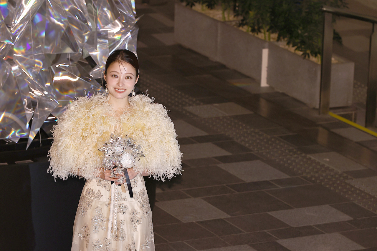 ブランド『ヴァレンティノ』のドレスで登場した橋本。さっそく点灯し、大阪・関西万博でも松尾氏が取り入れたアート装置『Kinetic Light Vision』の48個の球が光のリングが描く幻想的な風景に魅入り、終わったあとも、「すごく感動しました!3分間イルミネーションってこんなに早く終わるんだって感じて。球体の動きが幻想的でした。キラキラしたものも大好きだし、多面的な姿を見せてくれるので、折り目をつけて反射する姿で魅せてくれますね」と、目を輝かせた。